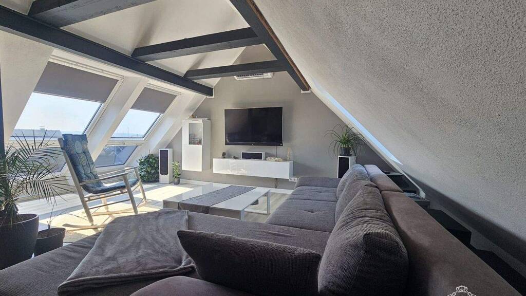 Das ausgebaute Dachgeschoss begeistert mit freigelegten Holzbalken, die dem Raum einen warmen und stilvollen Charakter verleihen. Eine architektonische Besonderheit stellen die Balkonfenster dar, die durch ihre spezielle Funktion für mehr Raumgefühl, Licht und Offenheit sorgen. Hier schauen Sie bis zum Fichtelberg.