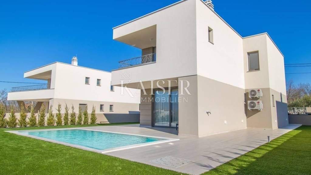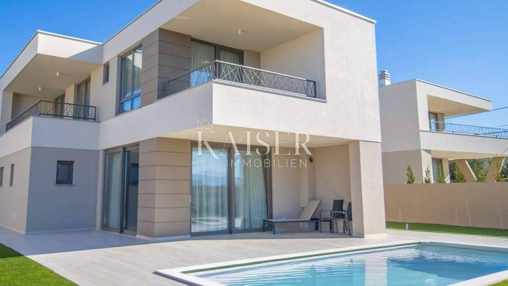 Kaiser immobilien vermittelt den Verkauf einer modernen Villa mit Swimmingpool im südwestlichen Teil der Insel Krk, Brzac. Das Gebäude hat eine Gesamtfläche von 164,80m2 und verteilt sich auf zwei Etagen. Im Erdgeschoss befinden sich neben dem Eingangsbereich ein offen gestalteter Wohnbereich von 43m2, ein Gästezimmer mit eigenem Bad, ein Abstellraum und eine Toilette. Das Wohnzimmer führt zu einer überdachten Terrasse von 13,5 m2. Im ersten Stock, der über eine Innentreppe erreichbar ist, befinden sich drei weitere Schlafzimmer mit Ausgang zu einer überdachten Terrasse und Panoramablick auf das Meer und die Insel Cres. Das Hauptschlafzimmer verfügt über einen Kleiderschrank, ein eigenes Badezimmer und einen Ausgang auf einen eigenen Balkon. Im ersten Stock gibt es ein zusätzliches Badezimmer. Der Bau und die Einrichtung wurden unter Verwendung hochwertiger Materialien und Geräte durchgeführt, unter anderem Porotherm-Ziegel in Kombination mit dem STO-Fassadensystem, elektrische Fußbodenheizung auf der gesamten Fläche - Regulierung über WLAN, LG-Klimaanlagen in jedem Raum und Wohnzimmer, hochwertige spanische Keramik. Figuren, Panorama-Hebeschiebewände aus PVC, Vorbereitung für Photovoltaikanlage auf dem Dach. Die Immobilie wird komplett möbliert und ausgestattet verkauft. Im angelegten Garten gibt es einen 21 m² großen Swimmingpool mit Liegewiese und Dusche. Der Pool ist zum Erhitzen von Wasser mit einer Wärmepumpe ausgestattet. Im Preis inbegriffen ist auch ein komplett fertiggestellter Garten mit Gartenbau, Bewässerung, Semmelrock-Pflastersteinen und einem ferngesteuerten Zaun, außerdem gibt es zwei Parkplätze mit Vorbereitung zum Laden von Elektrofahrzeugen. Die voraussichtliche Fertigstellung der Bauarbeiten ist im Sommer 2024. Der große Vorteil dieser Immobilie ist ihre Lage. Diese Villa liegt im südwestlichen Teil der Insel in einer ruhigen und sanften Umgebung, nur 5 Autominuten von den wunderschönen Stränden entfernt. Sie wird Sie mit den magischen Sonnenuntergängen am Mittelmeer und der Ruhe der nahegelegenen Olivenhaine verzaubern. Die Maklerprovision für den Käufer beträgt 3 % zzgl. MwSt. und wird beim Immobilienkauf bei Abschluss des ersten Rechtsgeschäfts gezahlt. ID-CODE 105-207