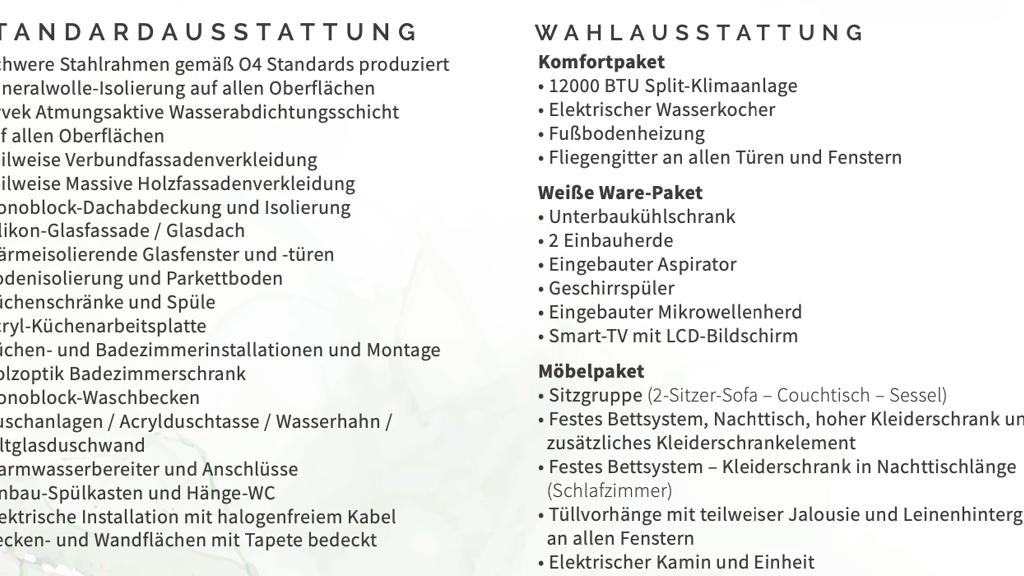 - das Grundstück - das Modulhaus nach neuestem Energiegesetz - die Genehmigung - sämtliche Anschlusskosten - eine Möblierung wie auf Bildern ist ebenfalls möglich