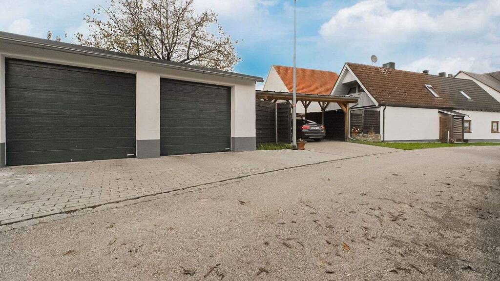 Auch die Außenanlagen präsentieren sich in einem sehr gepflegten Zustand. Eine überdachte Terrasse lädt zum Entspannen ein und bietet einen schönen Blick in den grünen Garten. Zwei Garagen sowie ein Carport bieten ausreichend Platz für Fahrzeuge, Fahrräder oder Freizeitgeräte.