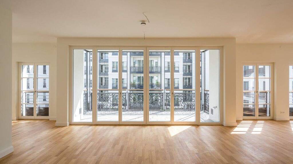 Direkt nach Betreten der Wohnung öffnet sich im Anschluss an die zentrale Diele ein großzügiger Wohnraum mit freiem Blick auf den Balkon. Eine Raumhöhe von rund drei Metern, fast raumhohe Fenster und teilweise doppelflügelige Zimmertüren erzeugen eine lichtdurchflutete, imposante Atmosphäre.