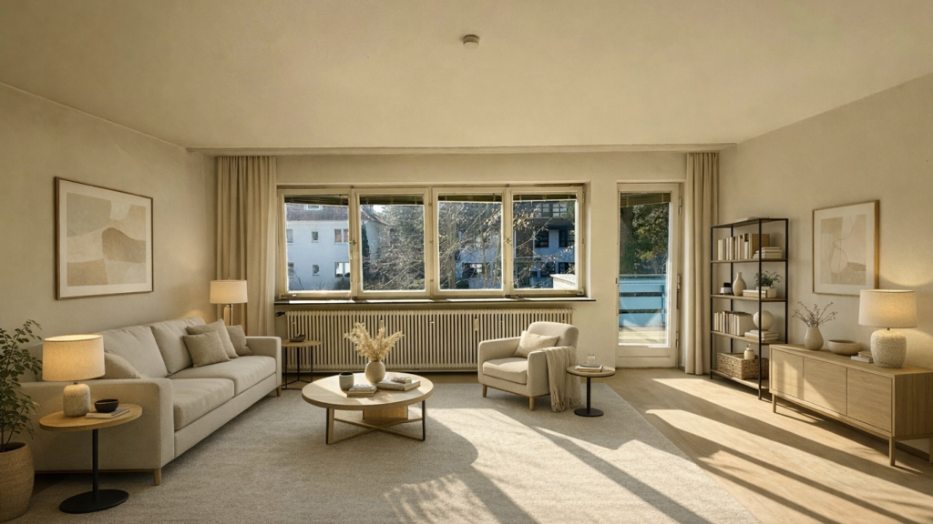 Die Wohnung verfügt über eine Wohnfläche von ca. 61 m² und bietet einen funktionalen Grundriss mit gut geschnittenen Räumen. Der Wohnbereich bietet ausreichend Platz für eine komfortable Wohn- und Esssituation, während das separate Schlafzimmer einen ruhigen Rückzugsort darstellt. Ergänzt wird das Raumangebot durch eine separate Küche sowie ein Badezimmer mit Badewanne.