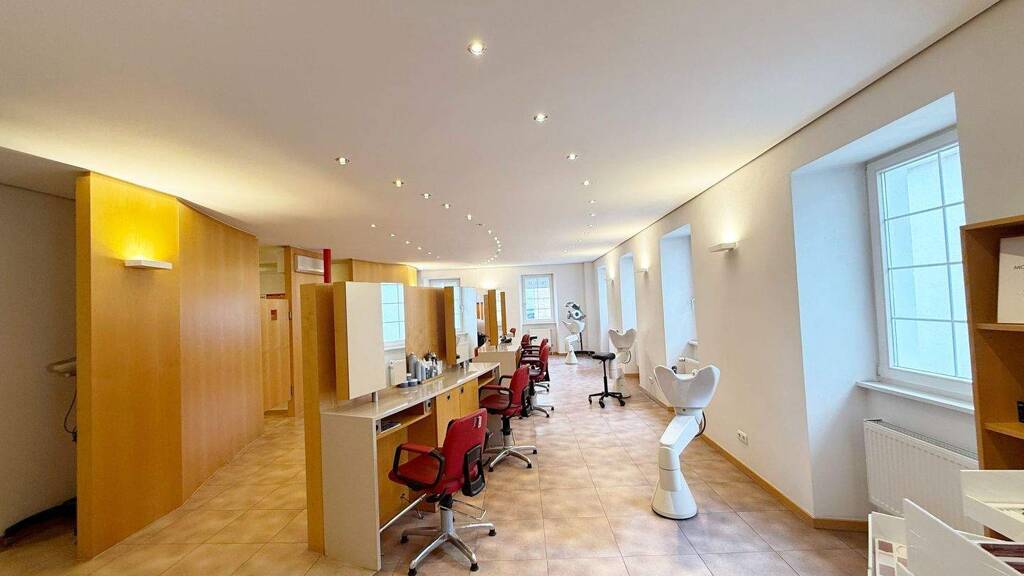 Der Salon verfügt über: * 5 Waschplätze mit komfortablen Waschbecken * 8 voll ausgestattete Friseurplätze * Exklusive, hochwertige Einrichtung * Rezeption mit praktischen Einbauschränken * Separater Raum für Fußpflege oder Kosmetik (inkl. Behandlungsstuhl) * Küche mit Einbauküche (EB-Schränke), Spülmaschine, Kühlschrank und Mikrowelle * 2 WC-Anlagen (Damen und Herren) * Hauswirtschaftsraum mit Warmwasserspeicher, Waschmaschine und Trockner sowie Einbauschränke.