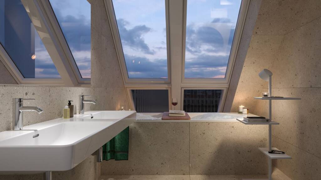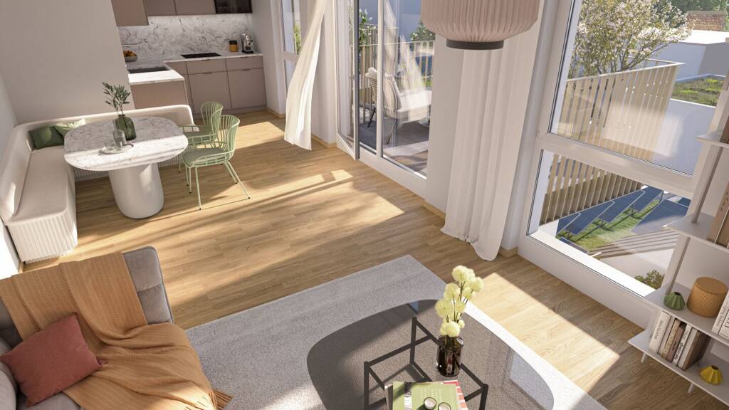 Die sorgfältig geplanten Eigentumswohnungen und Townhouses bieten mit ihren vielfältigen Grundrissen und Wohnungsgrößen für jede Lebensphase die ideale Wohnlösung. Ein behagliches Wohnambiente erzeugen die edlen Eichenparkettböden sowie die hochwertige Sanitärausstattung in den Bädern. Die Raumtemperatur lässt sich bequem über die Fußbodenheizung, die durch Fernwärme betrieben wird, sowie über die elektrisch bedienbaren Raffstores oder Rollläden regulieren. In den Dachgeschosswohnungen sorgen zusätzlich installierte Klimaanlagen dafür, dass es auch im Sommer angenehm kühl bleibt. Jede Wohneinheit verfügt über eine eigene private Freifläche, die die Wohnräume nach außen erweitert und einen idealen Rückzugsort für Erholung und Entspannung bietet.