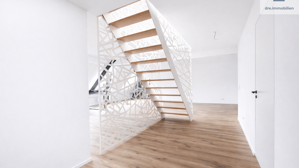 Ein besonderes architektonisches Highlight bildet der Treppenaufgang zum Spitzboden: Eine maßgefertigte Architektentreppe, gefertigt von einem renommierten Metallbauunternehmen aus dem Rheinland, fügt sich harmonisch und mit beeindruckender Leichtigkeit in das hochwertige Gesamtkonzept der Wohnung ein. Sie vereint Design und Funktion auf höchstem Niveau und unterstreicht den exklusiven Charakter dieser Immobilie.