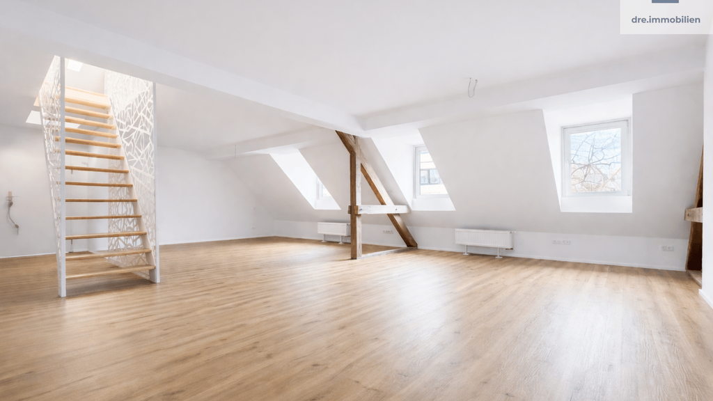 Im oberen Bereich erwartet Sie eine zusätzliche, charmante Ebene mit attraktiven Dachschrägen. Diese Fläche eignet sich ideal als Schlafbereich, Homeoffice oder Rückzugsort und verleiht der Immobilie eine besondere architektonische Note. Die Kombination aus Offenheit, Struktur und Gemütlichkeit schafft ein einzigartiges Wohnambiente.