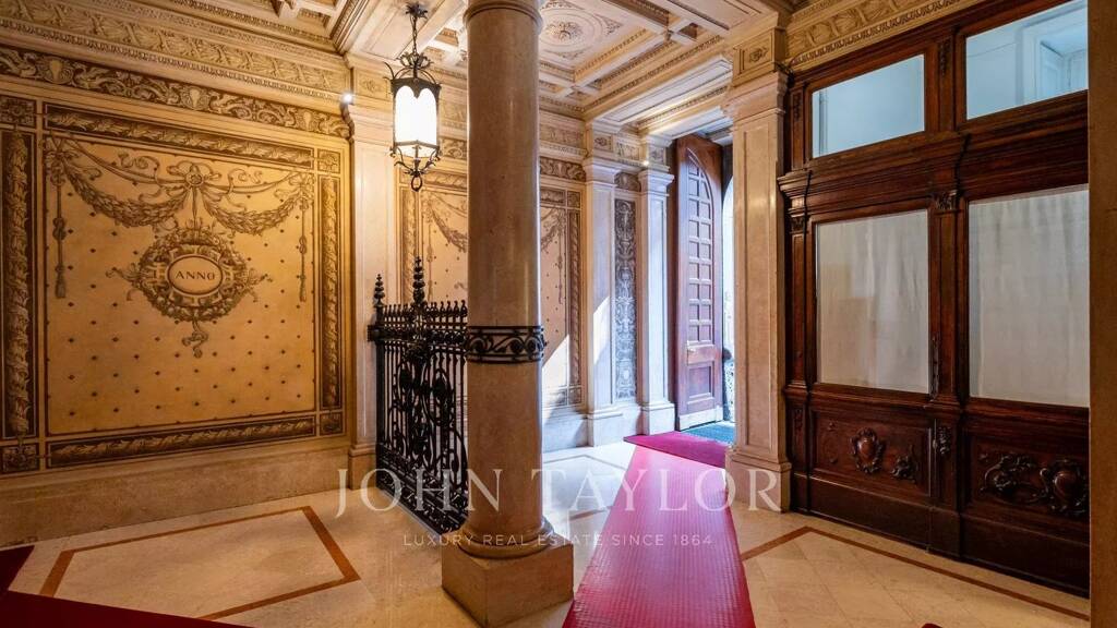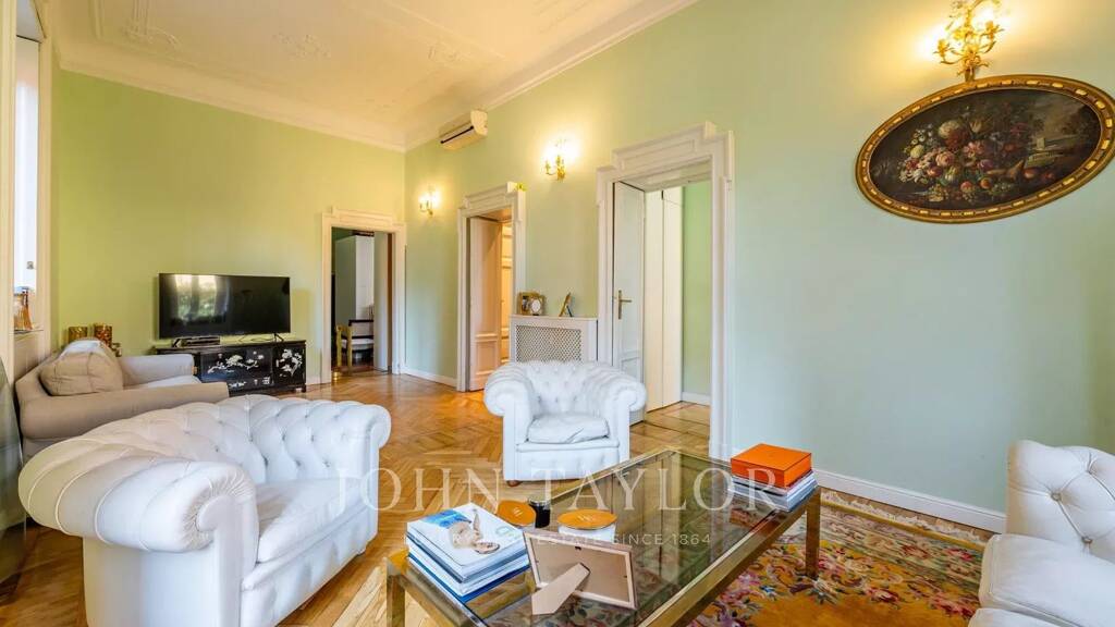 In an aristocratic period building of great architectural value with an elegant, frescoed entrance hall equipped with concierge service, exclusive residence of great charm, approx. 130 sqm, very bright and quiet, recently renovated with splendid high-end finishes. The entrance of the apartment opens into a large and versatile living area composed of a double living room with ceilings 3.75 meters high, dining area with splendid balconies overlooking greenery, eat-in kitchen, two double bedrooms, two bathrooms, two balconies, storage cellar. The apartment stands out for its versatile layout. Wonderful views of a splendid internal garden. Possibility of parking space nearby. Energy Class F.