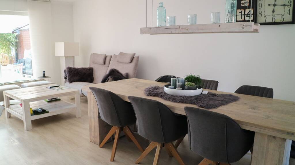 Erdgeschoss: Großes Wohnzimmer mit integriertem Essbereich (großer Flatscreen mit Kabel-TV, W-Lan inklusive), separate Einbauküche (mit Ceranfeld, Backofen, Mikrowelle und großer Kühl- und Gefrierkombination), Gästetoilette, Zugang zum gepflegten Garten mit Loungebereich