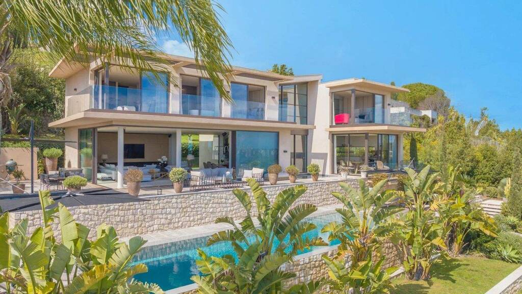 Perched in the prestigious and peaceful residential area of Golfe-Juan, this exceptional 624 m2 (575m2 living space) contemporary villa enjoys a panoramic vista of the Mediterranean and Cap d'Antibes.