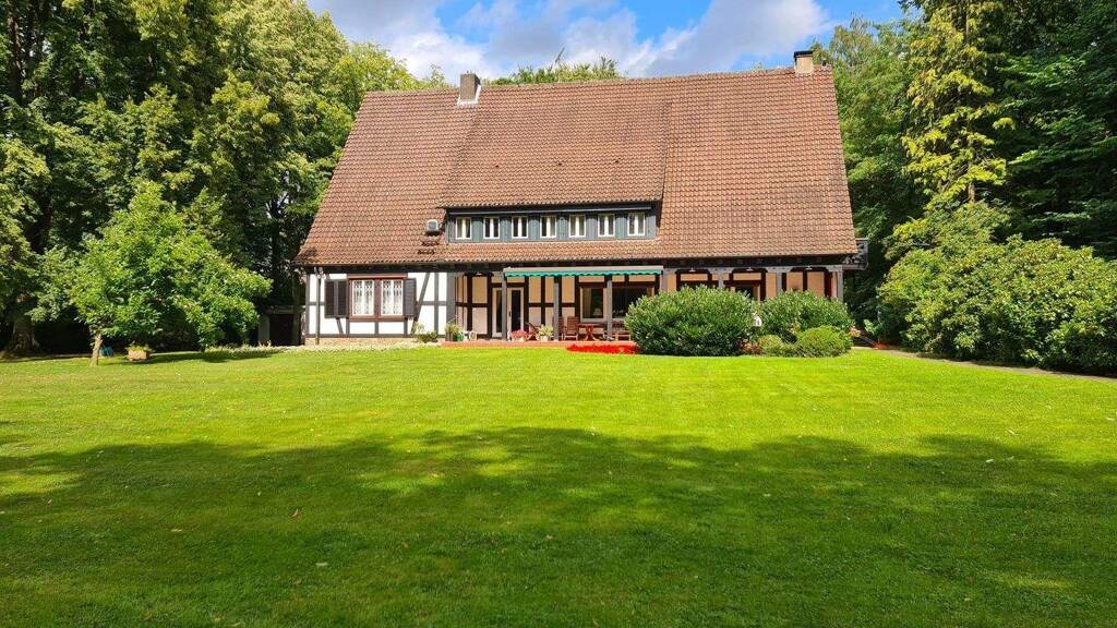 Auf einem ca.10.400 qm großen Grundstück steht das 1937 erbaute Landhausanwesen inmitten einer grünen Oase. Die Fachwerk-Villa beeindruckt durch ihre Großzügigkeit und bietet eine Wohnfläche von insgesamt ca. 543 m² auf drei Ebenen. Sie fügt sich perfekt in das weitläufige Grundstück einer malerische Landschaft ein und ist ideal für eine große Familie oder als repräsentative Residenz geeignet. Im Erdgeschoss des exklusiven Anwesens gelangen Sie über das Entrée in die sich dort befindenden Wohnbereiche, darunter ein großes Wohnzimmer mit Kamin, ein elegantes Esszimmer, ein stilvolles weiteres Zimmer, das als Büro oder Fernsehraum genutzt werden kann. Die voll ausgestattete Küche wird durch eine Speisekammer, einen Hauswirtschaftsraum sowie ein Personal-WC ergänzt. Natürlich gibt es auch eine Garderobe und ein Gäste-WC. Ebenso befindet sich auf dieser Ebene der zum Entspannen einladende Wellness-Bereich incl. eines Indoor-Pools. Die Räume haben viele Fenster und bieten einen atemberaubenden Blick auf den weitläufigen Garten. Im ersten Obergeschoss befinden sich die privaten Räume, darunter mehrere Schlafzimmer und drei Badezimmer, eines davon mit Zugang zum Balkon. Die großzügig geschnittenen Zimmer bieten ausreichend Platz und Privatsphäre für die Bewohner. Im zweiten Obergeschoss gibt es bislang zwei Zimmer, die für Personal oder Gäste genutzt wurden. Der trockene Keller ermöglicht ausreichend Stauraum. Platz für eine Weinlagerung oder einen Fitnessraum ist ebenfalls vorhanden. Der weitläufige Garten mit einer imposanten Allee ist ein absolutes Highlight der Immobilie. Auf dem großzügigen Grundstück finden sich gepflegte Grünflächen, eine große Terrasse und eine idyllische Sitzecke. Das Anwesen verfügt über 3 groß dimensionierte Garagen. Die Gesamtanlage befindet sich in einer ruhigen Alleinlage und ist ideal für anspruchsvolle Käufer, die Wert auf absolute Privatsphäre legen. Die Bausubstanz ist in einem sehr guten Zustand und wurde sorgfältig instand gehalten. Dennoch sind einige Renovierungs- und Verschönerungsarbeiten nötig, will man das Objekt auf einen modernen Stand bringen. Vereinbaren Sie noch heute einen Besichtigungstermin und lassen Sie sich von dieser einzigartigen Immobilie verzaubern.