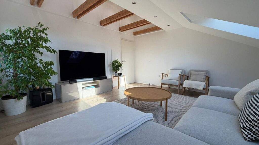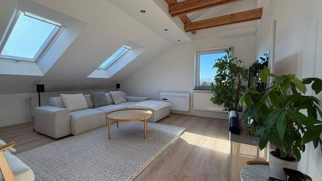 Sichtbare Dachbalken im Wohn- und im Kinderzimmer verleihen der Wohnung einen besonderen Charme und unterstreichen den gemütlichen Charakter der Dachgeschosswohnung. Große und helle Dachflächenfenster sorgen in den Räumen für viel Tageslicht und eine freundliche Atmosphäre.