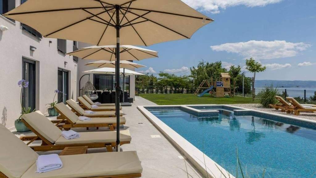 Bodentiefe Fenster heben den Blick nach draußen besonders hervor und sorgen dafür, dass die Räume mit natürlichem Licht durchflutet werden. Moderne Möbel und eine gute Ausstattung machen diese Immobilie zu einem idealen Ort für einen erholsamen Urlaub. Die Terrasse der Villa bietet einen schönen Panoramablick auf das Meer. Vor der Villa befindet sich auch ein Swimmingpool, der an heißen Tagen Erfrischung bietet, eine Liegewiese und ein Kinderspielplatz. Der Garten ist eingezäunt, so dass Sie hier absolute Privatsphäre genießen können.