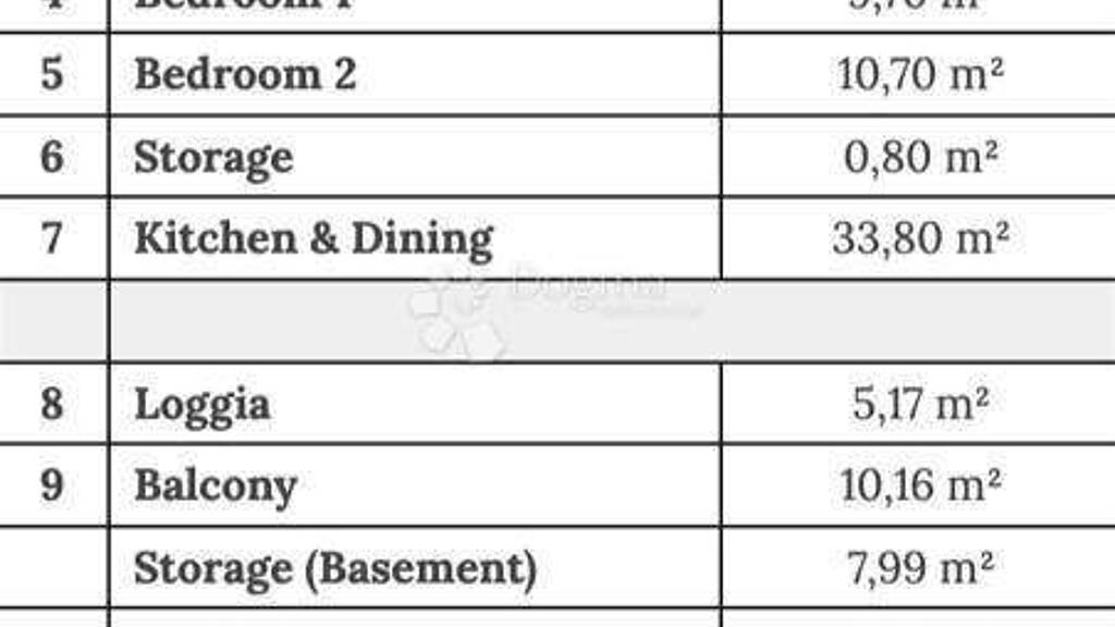 Der Grundriss ist so gestaltet, dass er Leichtigkeit und Helligkeit in den Alltag bringt. Das großzügige Wohnzimmer mit Küche und Essbereich (33,80 m) bildet das Herz des Zuhauses und öffnet sich nahtlos zur Loggia und zum Balkon Innen- und Außenräume gehen hier ineinander über. Zwei Schlafzimmer (9,70 m und 10,70 m) bieten Ruhe und Privatsphäre, während zwei moderne Badezimmer Funktionalität und Komfort sichern. Ein kleiner Abstellraum innerhalb der Wohnung sowie ein zusätzliches Kellerabteil (7,99 m) runden das praktische Gesamtbild ab.