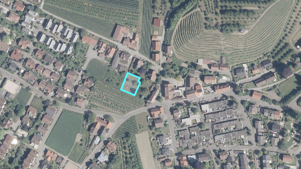 Hinweis: Auf dem Luftbild ist noch das ursprüngliche, ungeteilte Grundstück zu sehen. Im beigefügten Lageplan entspricht das Verkaufsobjekt der rechten Hälfte. Quelle Luftbild: Landesamt für Geoinformation und Landentwicklung Baden-Württemberg (LGL BW), www.lgl-bw.de