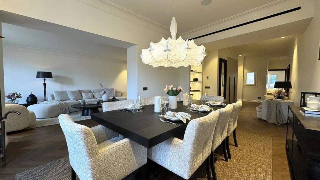 Der weitläufige Wohnbereich bildet das Herzstück der Wohnung: offen gestaltet, repräsentativ und dank bodentiefer Fenster lichtdurchflutet. Die elegante, voll ausgestattete Küche mit hochwertigen Geräten und edlen Oberflächen fügt sich nahtlos in das Raumkonzept ein und schafft den perfekten Rahmen für kulinarische Erlebnisse. Der angrenzende Essbereich lädt zu geselligen Abenden ein - mit Blick auf den Plaça del Rei Joan Carles I und das pulsierende Stadtleben.