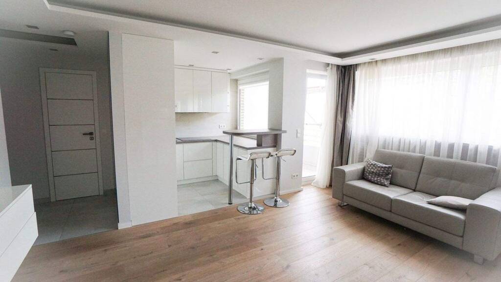 Die angebotene Wohnung ist mit hochwertigen Möbeln, einer eleganten Einbauküche mit Esstheke und Waschmaschine sowie einem LED-Lichtsystem ausgestattet