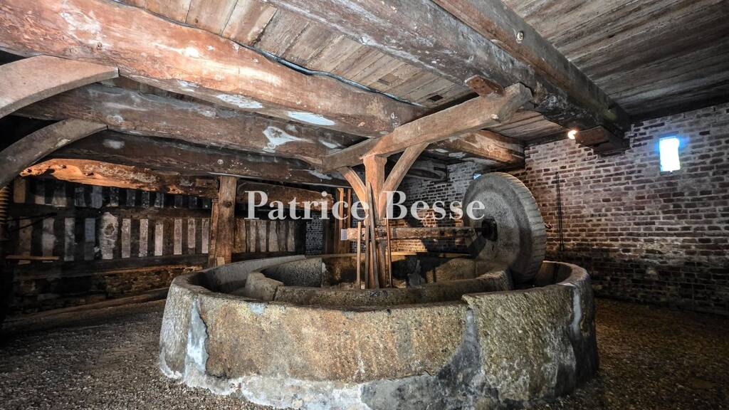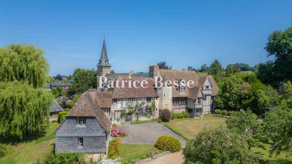 When you approach the manor house from the street, a listed stone gateway marks the boundary of the property. Flanked by a perimeter wall, it opens onto a garden planted with trees, which the buildings are arranged around. There are two 15th century timber-framed houses, which have been listed as historic monuments since 2004. The small manor house is two storeys high. It is set at an angle to the larger, three-storey building, with a 13th-century octagonal stone stair tower at its centre. Gables and dormer windows liven up the façades, which combine half-timbering, cob and stone or brick bases in a checkerboard pattern typical of the Auge region. The double-pitched, flat-tiled roofs have sculpted corbelled dormers. At the end of the large manor house, a former farm building contains a 17th-century cider press. The small manor house can be identified by its wooden sculpture of a bishop's head on a door frame post. Opposite, an 18th-century orangery has been converted to be used for receptions and exhibitions. The property is set in vast enclosed grounds planted with trees. The landscaping of the plot enhances the buildings. Two outbuildings are set back beyond the small manor house. The softly laid-out English-style gardens are dotted with flower beds, pathways and wooded areas. Fruit trees and groves line the walls, while the listed boundary wall provides visual continuity with the buildings.