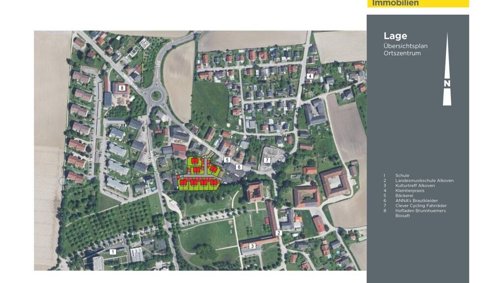 Die Verbindungsstraße und der Gehweg sowie ein allgemeiner Treffpunkt-Platz inmitten der Anlage verbleibt im schlichten Miteigentum aller 14 Hauseigentümer. Die Lage in Alkoven in der Dorfstraße 5 und 7 spricht für sich, besuchen Sie unsere Liegenschaft vor Ort, eine Bautafel kennzeichnet die unbebaute Wiese, auf der die DORFLIEBE #5#7 im Grünen entstehen soll.