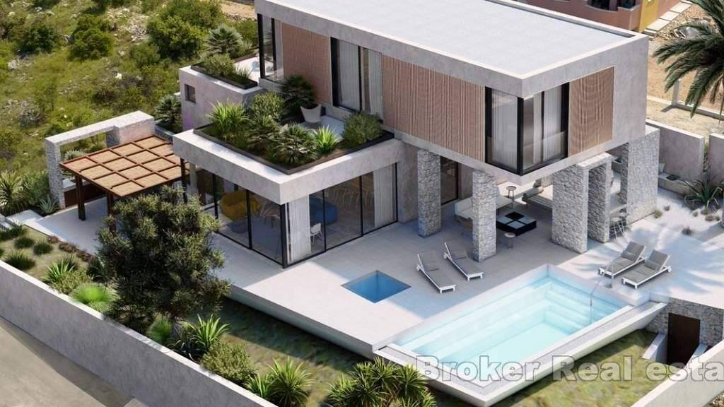 Moderne Villa mit Pool, im Bau, mit Meerblick, Gesamtwohnfläche 246 m2, auf einem Grundstück von 687 m2. Das Anwesen hat eine hervorragende Lage, auf einer leichten Anhöhe, die einen ungehinderten Blick auf das Meer bietet.