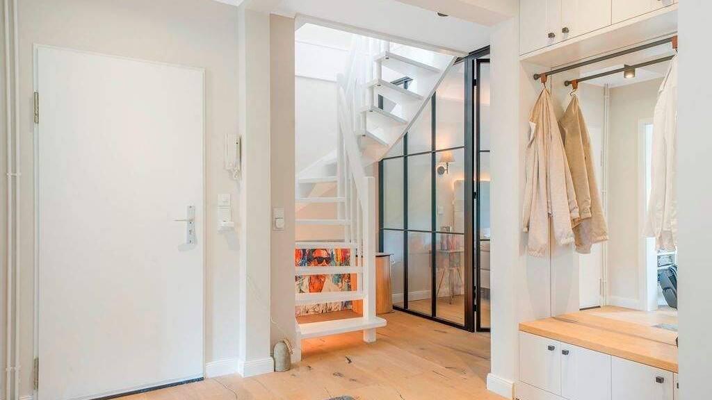 Besonders hervorzuheben ist das moderne Design des Schlafzimmers, welches durch eine stilvolle Sprossenglaswand abgetrennt ist, die ein offenes sowie luftiges Ambiente schafft.