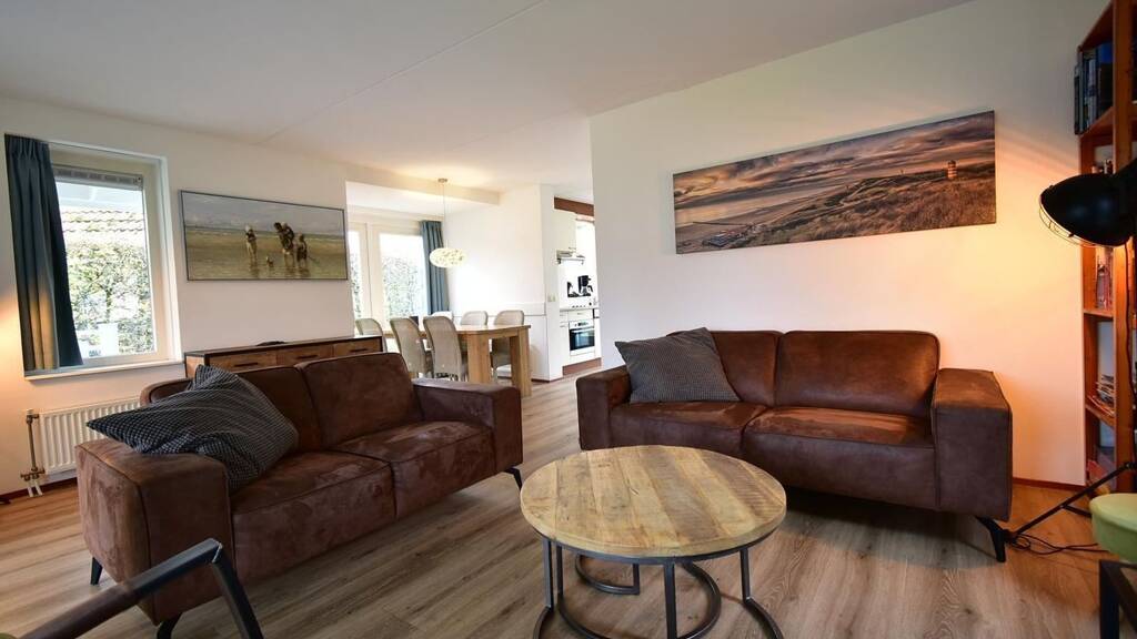 Das Wohnzimmer ist durch die vielen Fenster und die doppelte Terrassentür zur Veranda hell und großzügig. Die Sitzecke mit zwei bequemen Sofas und Sessel bietet Blick in den Garten. Die Holzcouchtische und der pvcboden in Holzoptik sorgen für eine warme Atmosphäre. Auf der anderen Seite des Raumes steht ein großer Esstisch mit sechs Stühlen am Fenster, sodass Sie beim Essen schön auf das viele Grün rund um das Haus blicken.