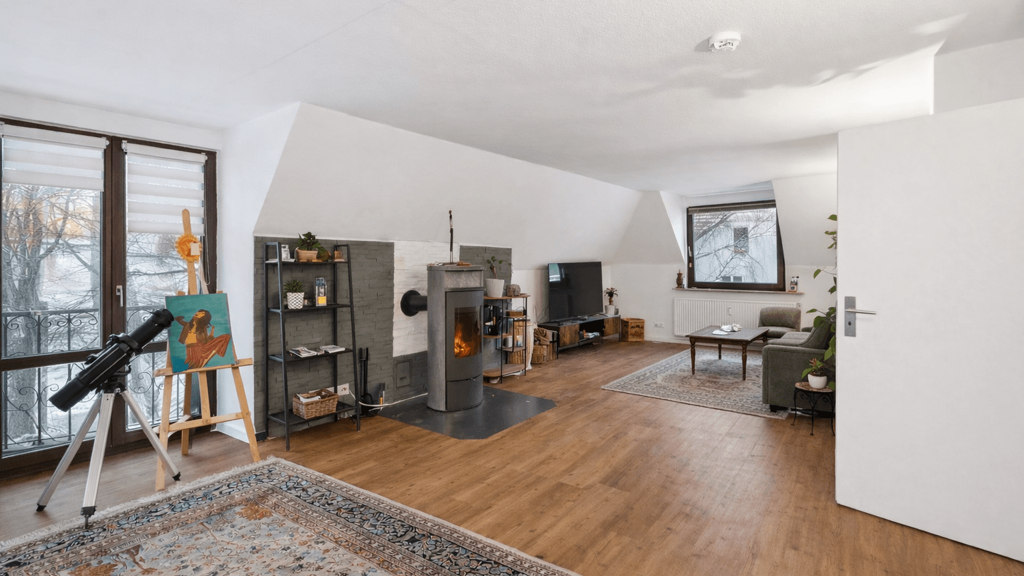 Die Wohnung verfügt über ca. 73 m² Wohnfläche und überzeugt durch einen großzügigen Wohn- und Essbereich, eine Küche, einen einladenden Flur, ein Schlafzimmer sowie ein modern ausgestattetes Tageslichtbad mit Wanne, das im Jahr 2021 vollständig erneuert wurde. Große, teilweise bodentiefe Fenster sorgen für eine hervorragende Belichtung des Wohnbereichs und schaffen eine freundliche, offene Atmosphäre. Ein Kaminofen bietet zusätzlich Behaglichkeit, insbesondere in den kälteren Monaten.