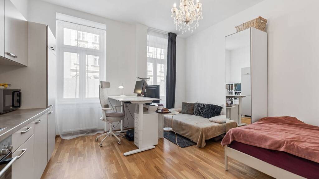 Die Wohnung bietet einen angenehm gestalteten Wohn- Schlafraum mit Küchenzeile sowie ein Badezimmer mit Dusche und WC. Aufgrund der für Altbauwohnungen typischen Raumhöhe wäre es möglich z.B. platzsparend ein Hochbett mit darunter liegendem Schreibtisch bzw. Büro zu installieren.