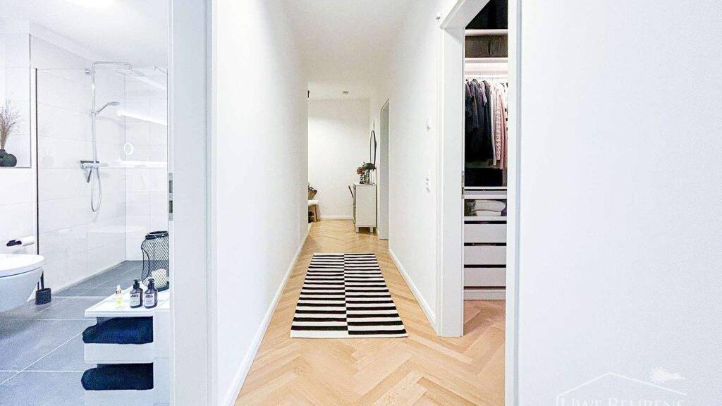 Neben dem offenen Wohnbereich stehen Ihnen zwei helle Schlafzimmer zur Verfügung, jeweils mit einem abgeteilten Ankleidebereich, der zusätzlichen Stauraum und Komfort bietet. Hochwertige Echtholzparkettböden in den Wohn- und Schlafräumen sowie elegante Fliesen in den Sanitärbereichen unterstreichen den exklusiven Charakter der Wohnung. Eine Fußbodenheizung sorgt in allen Räumen für behagliche Wärme.