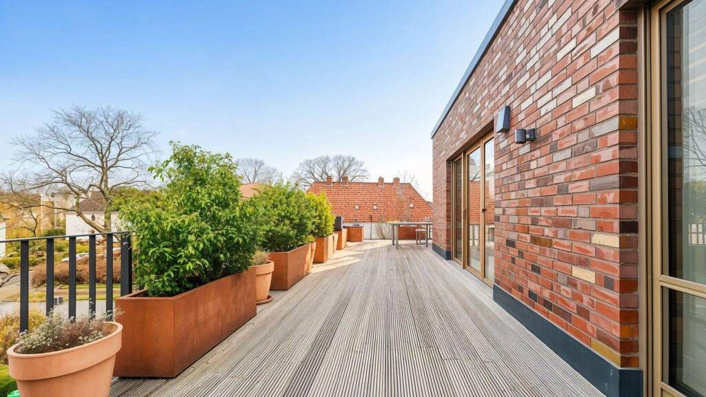Die weitläufige Terrasse bietet vielfältige Gestaltungsmöglichkeiten - von großzügigen Lounge- und Essbereichen bis hin zu urbanem Gärtnern - und eröffnet einen beeindruckenden Blick über die Dächer von Buxtehude. Ob entspannte Stunden im Freien, gesellige Abende oder ruhige Rückzugsorte: Diese Dachterrasse erweitert den Wohnraum auf einzigartige Weise und unterstreicht den exklusiven Charakter der Immobilie.