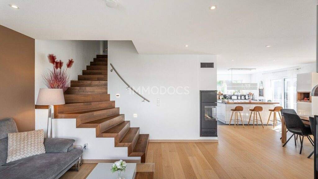 Die Ausstattung überzeugt mit Echtholzparkett, Fußbodenheizung im gesamten Haus, exklusiven Armaturen (Grohe, Villeroy & Boch), einer Berbel-Dunstabzugshaube sowie moderner Smart-Home-Technik (Busch-Jäger, Alexa). Eine Photovoltaikanlage, Wärmepumpe, Wasserenthärtungsanlage und die Bauweise im KfW-55 Standard unterstreichen die Energieeffizienz des Hauses.
