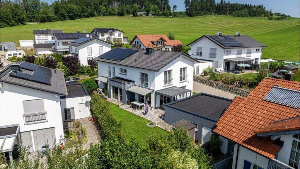 Abgerundet wird das Angebot durch eine Doppelgarage mit Wallbox, elektrischem Hörmann-Tor sowie mehrere Außenstellplätze.