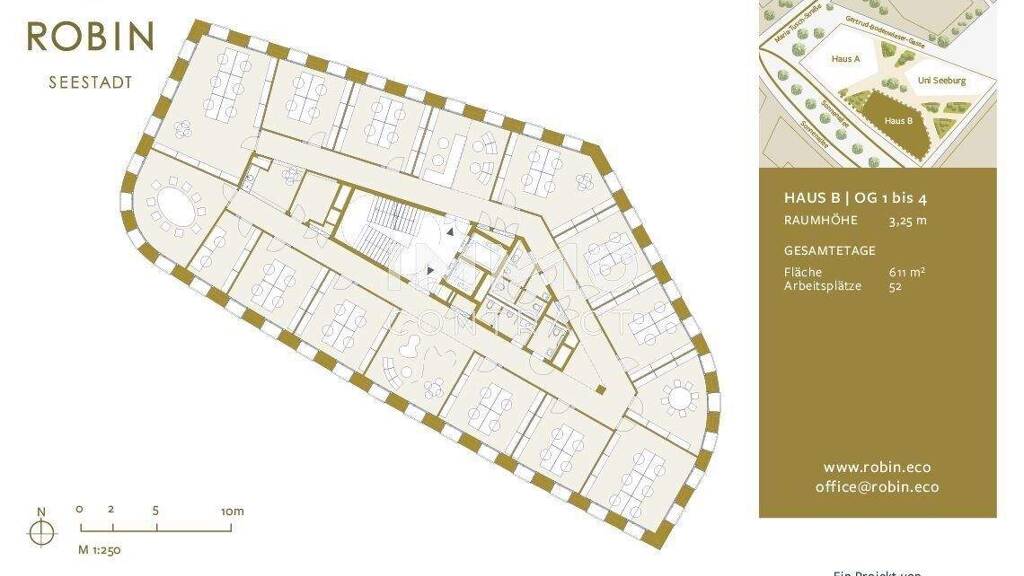 ROBIN Seestadt kombiniert bewährte Bautradition mit innovativen Low-Tech-Lösungen und bietet in diesem neuen umweltfreundlichen & kosteneffizienten Ensemble den nachhaltigsten Workspace der Stadt. Das energieautarke Gebäude kommt ganz ohne Kosten für Heizung- & Kühlung aus. ROBIN Mieter profitieren nicht nur ganzjährig vom per Sensortechnik gesteuerten Raumklima mit optimaler Luftqualität, sondern vor allem auch von der minimalen Kostenbelastung. Der Gesamt-CO2-Ausstoß ist - ebenso wie die Betriebskostenbelastung - um ca. 40% niedriger als bei konventionellen Gebäuden.