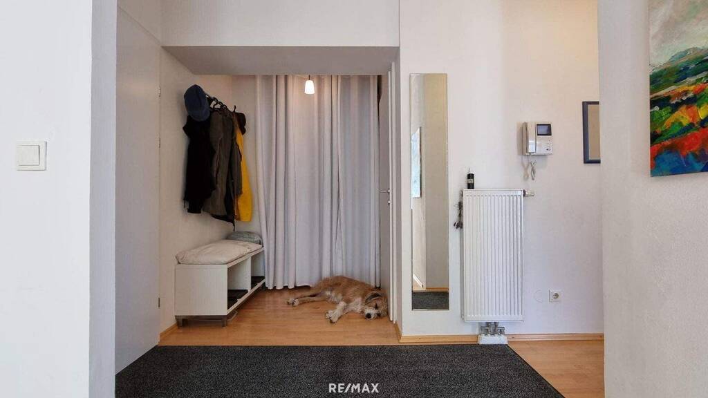 Bereits beim Betreten der Wohnung erwartet Sie ein freundlicher Vorraum, der in ein helles Büro führt. Dieser Raum bietet durch seine Lichtdurchflutung vielfältige Nutzungsmöglichkeiten - ob als Arbeitszimmer oder Rückzugsort. Vom Büro aus gelangen Sie direkt in das liebevoll eingerichtete Schlafzimmer, das mit seiner angenehmen Atmosphäre überzeugt.