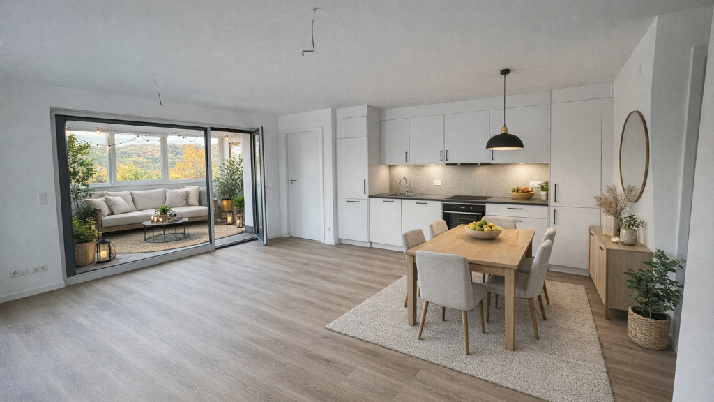 Diese attraktive Neubauwohnung im Obergeschoss vereint modernen Wohnkomfort mit einer durchdachten Raumaufteilung. Der großzügige Wohn- und Essbereich ist lichtdurchflutet und bietet direkten Zugang zu einem gemütlichen Wintergarten, der sich ideal als zusätzlicher Wohnraum, Pflanzenoase oder ruhiger Rückzugsort nutzen lässt. Ein angrenzender Balkon erweitert den Wohnkomfort nach draußen und lädt zu entspannten Stunden an der frischen Luft ein.