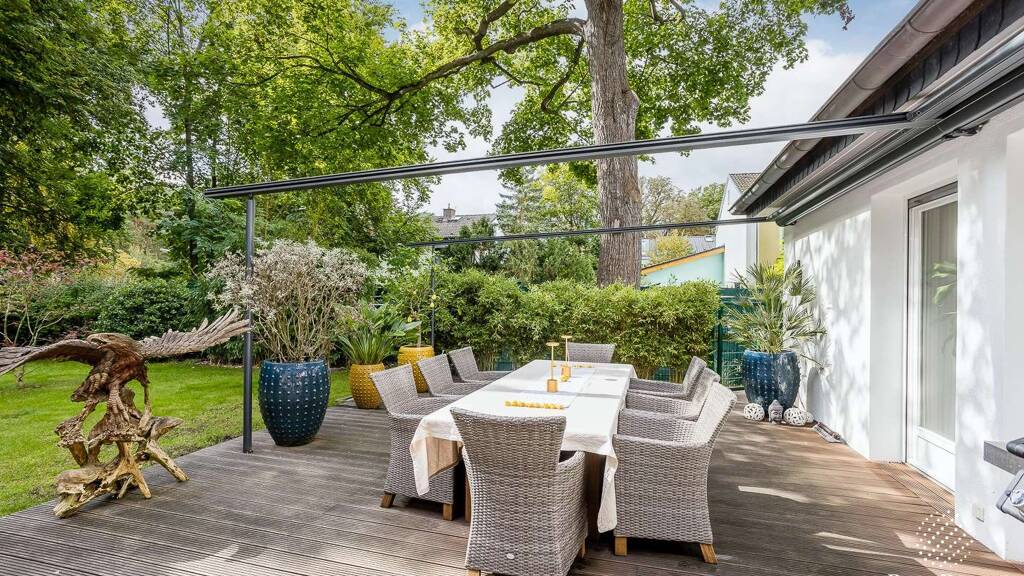 Im Erdgeschoss prägen großzügige Wohn- und Essbereiche mit direktem Bezug nach draußen das Raumgefühl. Ein weiteres starkes Merkmal sind die großen, südlich ausgerichteten Terrassen mit insgesamt ca. 84 m² Fläche, die den Garten zu einem echten Erweiterungsraum des Wohnens machen. Das Haus präsentiert sich durch die Modernisierung 2019 in einem neuwertigen Gesamteindruck.