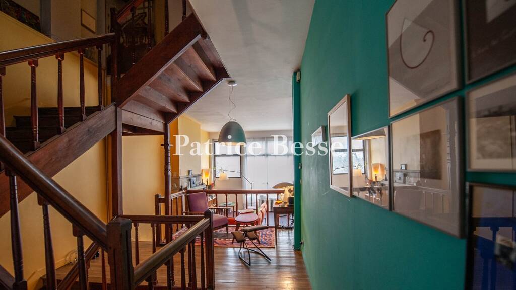 This landing dominates a lounge as it is slightly raised. It is fitted with baluster railings that bring the stairway to mind. A few wooden steps go down to the living room, illuminated via a large picture window. This is where, because of its luminosity, Jean-Georges had his art studio. The ceiling is 3.8 m high. A stone fireplace houses a ...