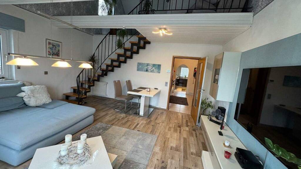 . 3 Zimmer . Wohnung im 1. Obergeschoss . Zwei Schlafzimmer . Ein Badezimmer mit Badewanne . Offene Galerie . Teilmöbliert nach Absprache . Einbauküche inklusive . Böden: Steinfliesen und Laminat