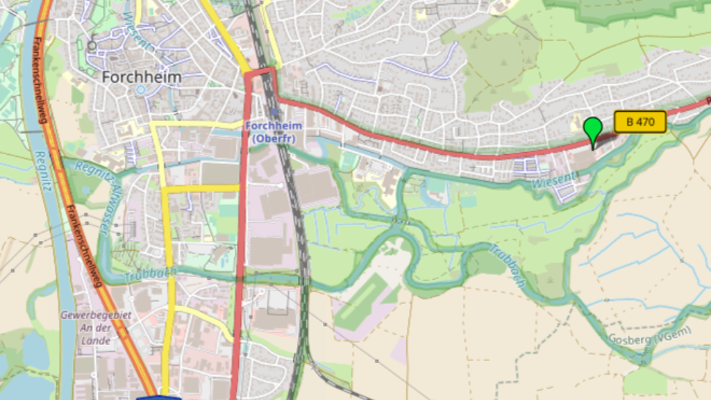 In der Bayreuther Straße in 91301 Forchheim . gut sichbar von der Bayreuther Straße (B 470) mit einer Frequenz von ca. 30.000 Autos pro Tag . Regional- und S-Bahnhof sowie der zentrale Omnibusbahnhof (ZOB) in ca. 5 Fahrminuten Entfernung . Bushaltestelle "Spinnerei" der Linien 222 und 223 unmittelbar an der Grundstücksgrenze . Die Autobahnanschlüsse Forchheim Nord und Forchheim Süd sind in zwölf Minuten Fahrzeit bequem erreichbar