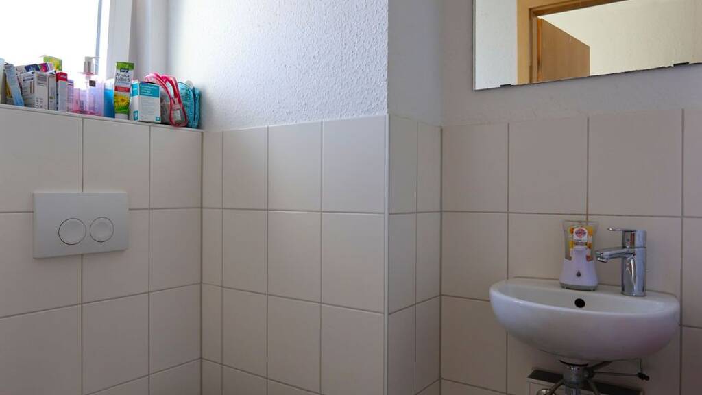 Im Obergeschoss befinden sich die zwei großen Schlafzimmer sowie das Tageslichtbad mit Badewanne und Dusche.