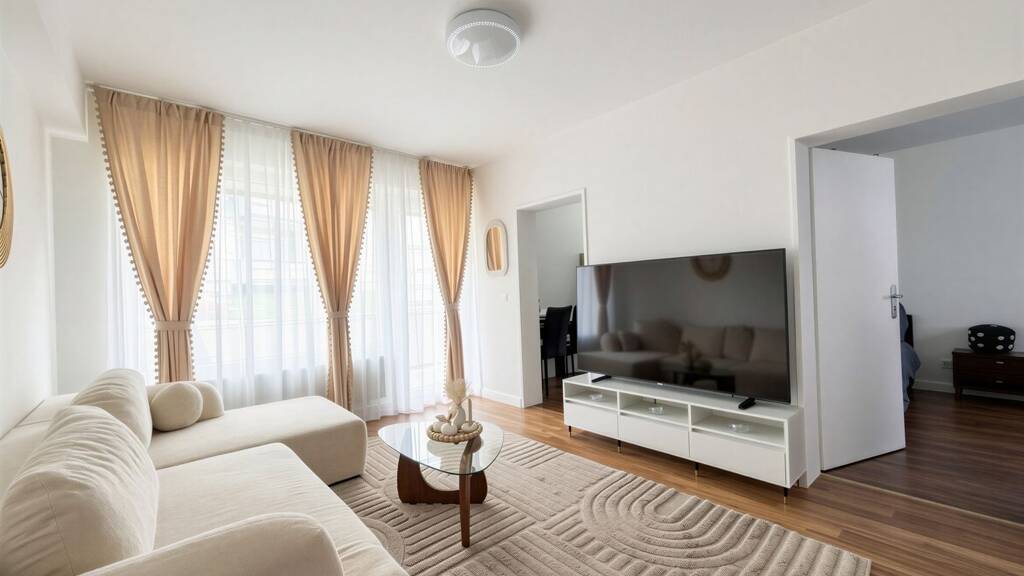 Vom Flur aus gelangen Sie in das geräumige Wohnzimmer, welches Platz für gemütliche Stunden mit Familie und Freunden bietet. Ein Highlight ist der Zugang zum Balkon, auf dem aus Sie herrliche Sommerabende genießen können. Angrenzend an das Wohnzimmer befindet sich die moderne Küche, die zum Kochen und Genießen einlädt.