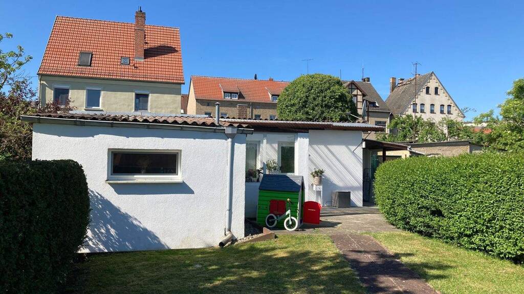 Gartengerätehaus rechts des Weges kann weiter genutzt werden.