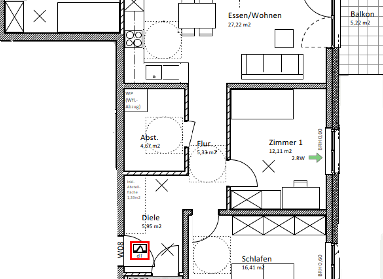 - Balkon (gesamt 1,3 m²)