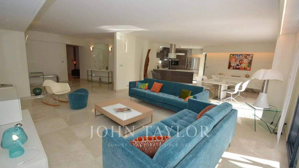 Großer Empfang mit Wohnzimmer, Esszimmer und amerikanischer Küche, die sich zur Terrasse hin öffnen.