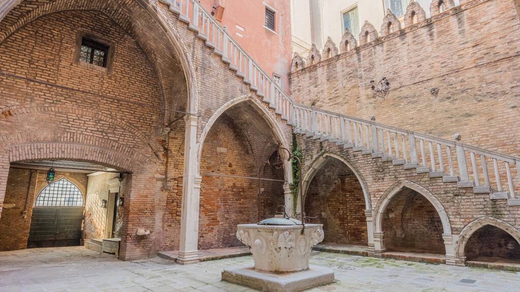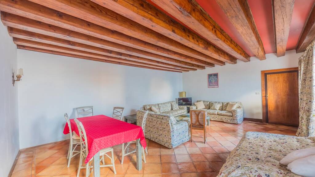 Im Inneren der Immobilie erwartet Sie ein großzügig geschnittenes Wohnzimmer, welches das Highlight der Wohnung ist und seinen ganz eigenen Charme versprüht. Die sichtbaren alten Holzbalken erzeugen eine fast schon magische Atmosphäre und unterstreichen die Einzigartigkeit dieser Immobilie. Die Schlafzimmer der Wohnung sind geräumig und lichtdurchflutet und bieten genügend Platz für eine individuelle Gestaltung. Zudem verfügt die Immobilie über einen idyllischen Brunnen, der – ganz im venezianischen Stil – im Innenhof am Eingang entspringt. Ein wahrer Hingucker und ein weiteres Detail, das diese Wohnung zu einem außergewöhnlichen Zuhause macht.