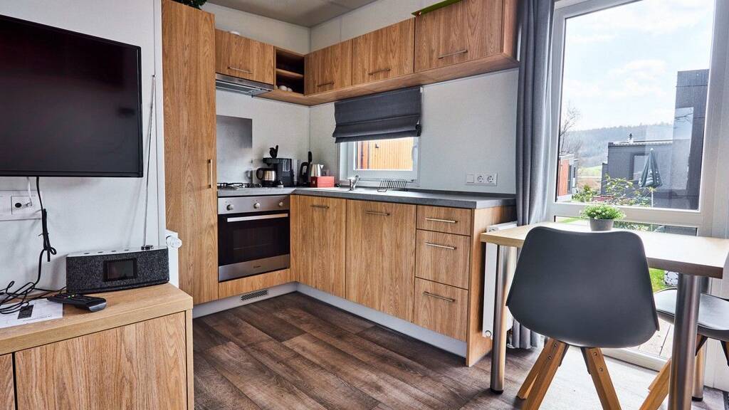 Das Tiny House hat eine Grundfläche von rund 26 qm und bietet Platz für bis zu 4 Personen. Beheizt wird das ganzjährig nutzbare Ferienhaus mit Erdgas. Das durchdachte Raumangebot umfasst das Schlafzimmer, den Wohnbereich mit Schlafcouch, die Küchenzeile, das separates Bad mit Dusche und WC sowie die Terrasse mit Tisch, 4 Stühlen und Sonnenschirm.