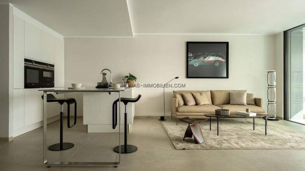 Bodenbeläge und Türen: In der gesamten Wohnung sind Keraben-Feinsteinzeugböden mit wandbündig integrierten Sockelleisten verlegt. Die Eingangstür ist von Schmidt Visbek, IV7G, aus Meranti-Holz. Die Innentüren sind weiß mit verdeckten Beschlägen und Magnetschloss sowie Aluminiumgriffen von Hoppe (Modell Amsterdam).