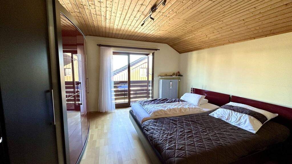 Im Obergeschoss befinden sich zwei Schlafzimmer, eines davon mit Zugang zum Ostbalkon. Ein kleines Duschbad ist ebenfalls vorhanden. Abstellflächen in den Dachschrägen bieten zusätzlichen Platz.
