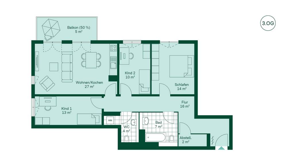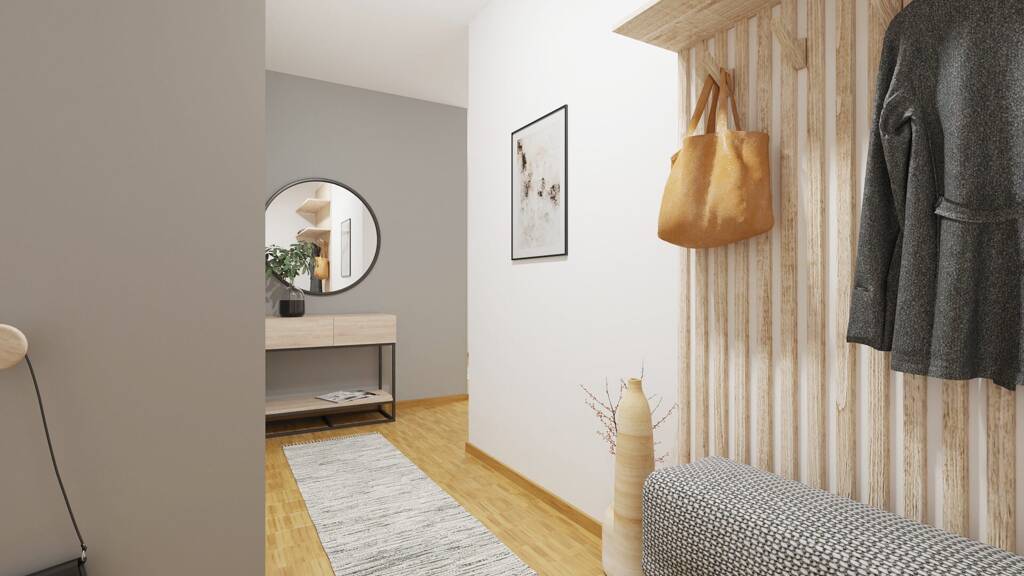 Treten Sie ein in den geräumigen Flur, der Ihnen Zugang zu allen Zimmern bietet. Auf Ihrem Weg durch den Flur erreichen Sie zunächst das komfortable Schlafzimmer. Mit bodentiefen Fenstern und genügend Platz für Ihren Kleiderschrank bietet dieses Zimmer den idealen Ort für maximale Erholung. Zwei Kinderzimmer bieten Platz für die Kleinen oder Ihr Home Office. Das Herzstück der Wohnung ist das helle Wohnzimmer mit offener Küche, in der Sie gemeinsam kochen und köstliche Mahlzeiten zubereiten können. Von hier aus gelangen Sie auch auf den gemütlichen Balkon, der zum Verweilen an der frischen Luft einlädt. Das moderne Badezimmer mit bodengleicher Dusche und das separate Gäste-WC runden das Angebot ab. Ein praktischer Abstellraum sorgt für zusätzlichen Stauraum.