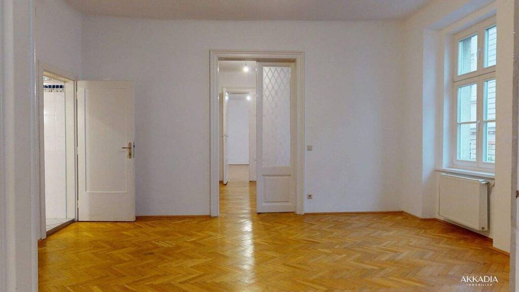 Beim Betreten der Wohnung gelangt man in den großen Vorraum, von dem aus nahezu alle Räume separat begehbar sind. Die sechs Zimmer präsentieren sich großzügig und bieten durch den durchgehenden Fischgrätparkett ein elegantes, warmes Wohnambiente. Die separate Küche bietet ausreichend Platz für Kochbereich und Stauraum. Das Badezimmer sowie das getrennte WC liegen praktisch angeordnet im hinteren Bereich der Wohnung.