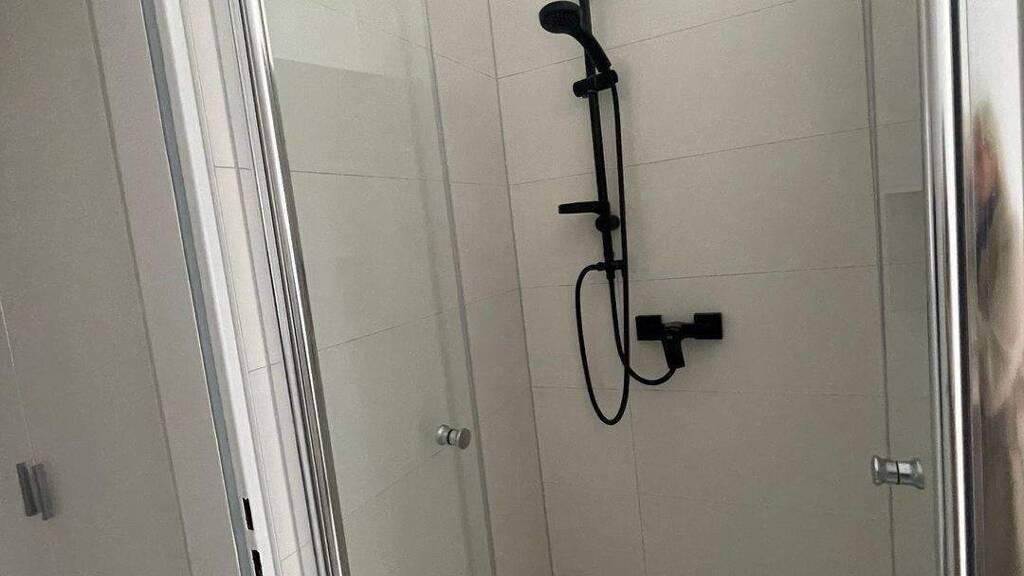 Das Badezimmer verfügt über eine ebenerdige Dusche.